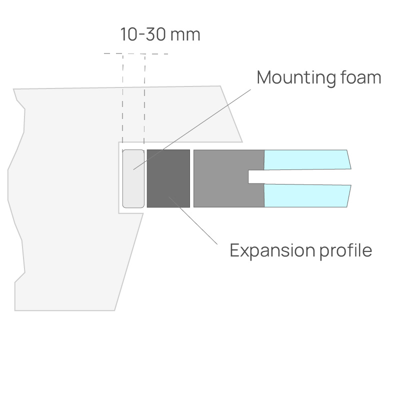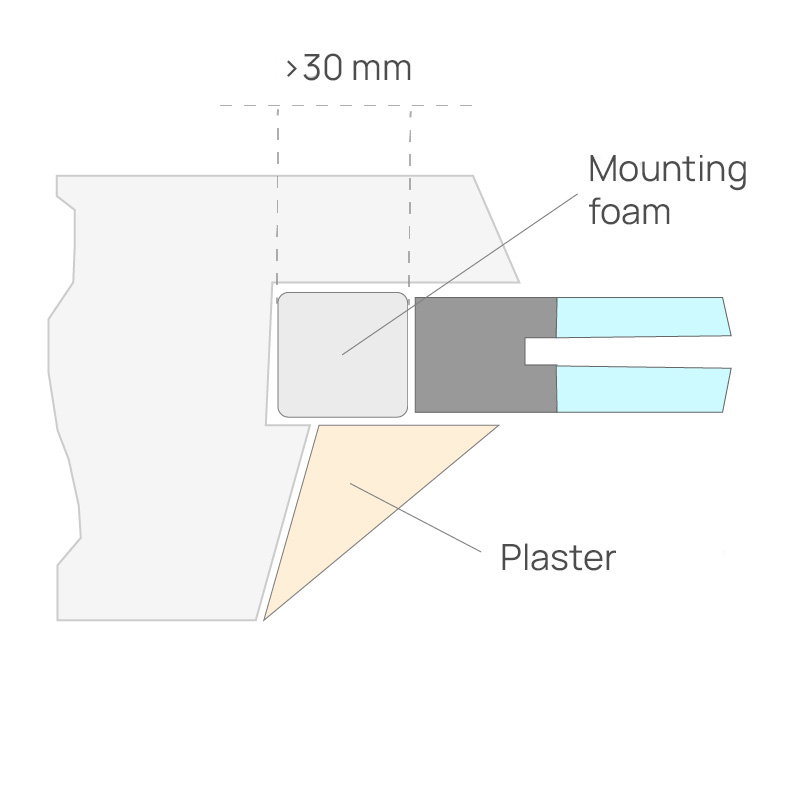 Wysokość ramy okiennej określa się poprzez odjęcie szczeliny montażowej u góry (15-20 mm) i wysokości profilu bazowego (30 mm) od wysokości otworu okiennego (najmniejsza wartość z trzech pomiarów pionowych).