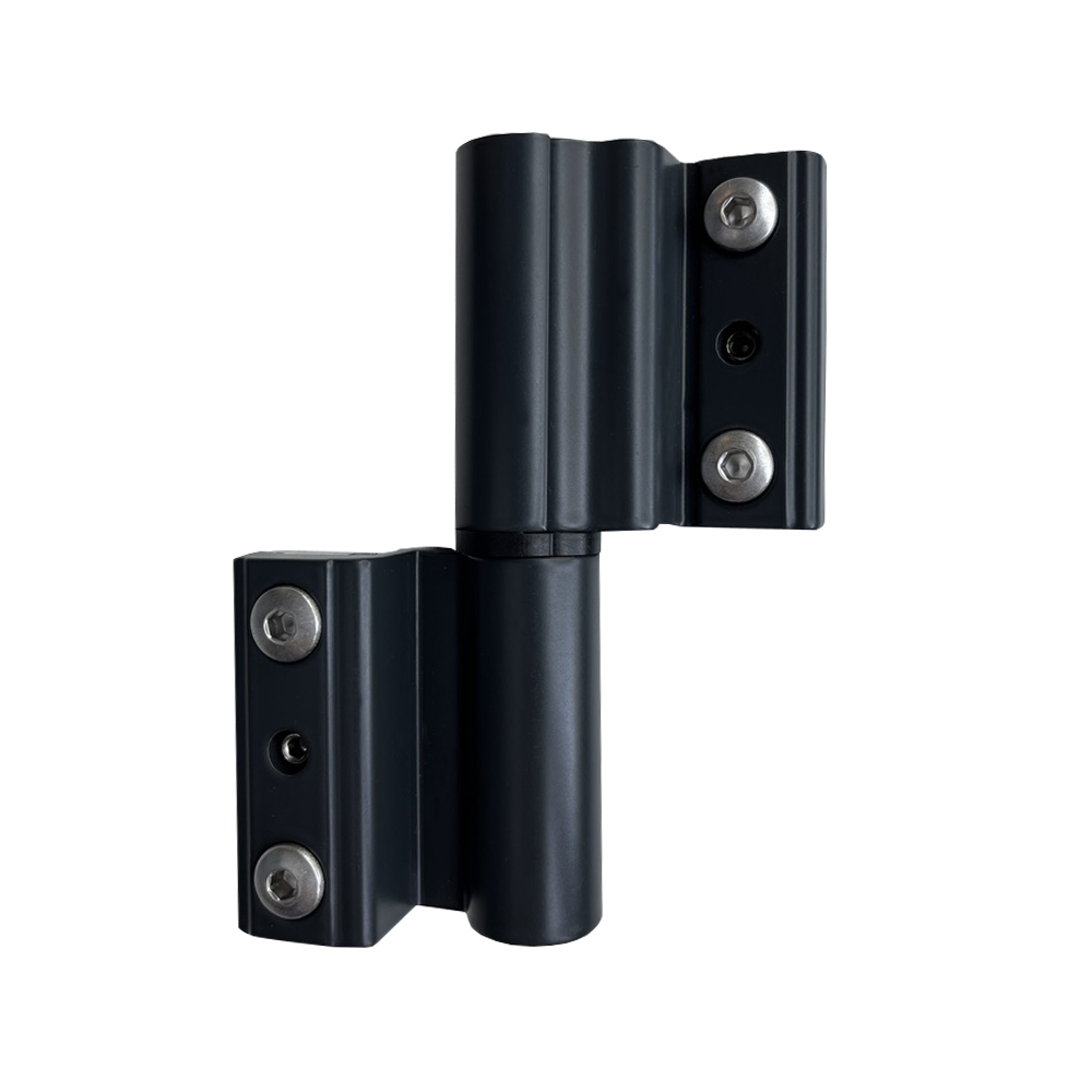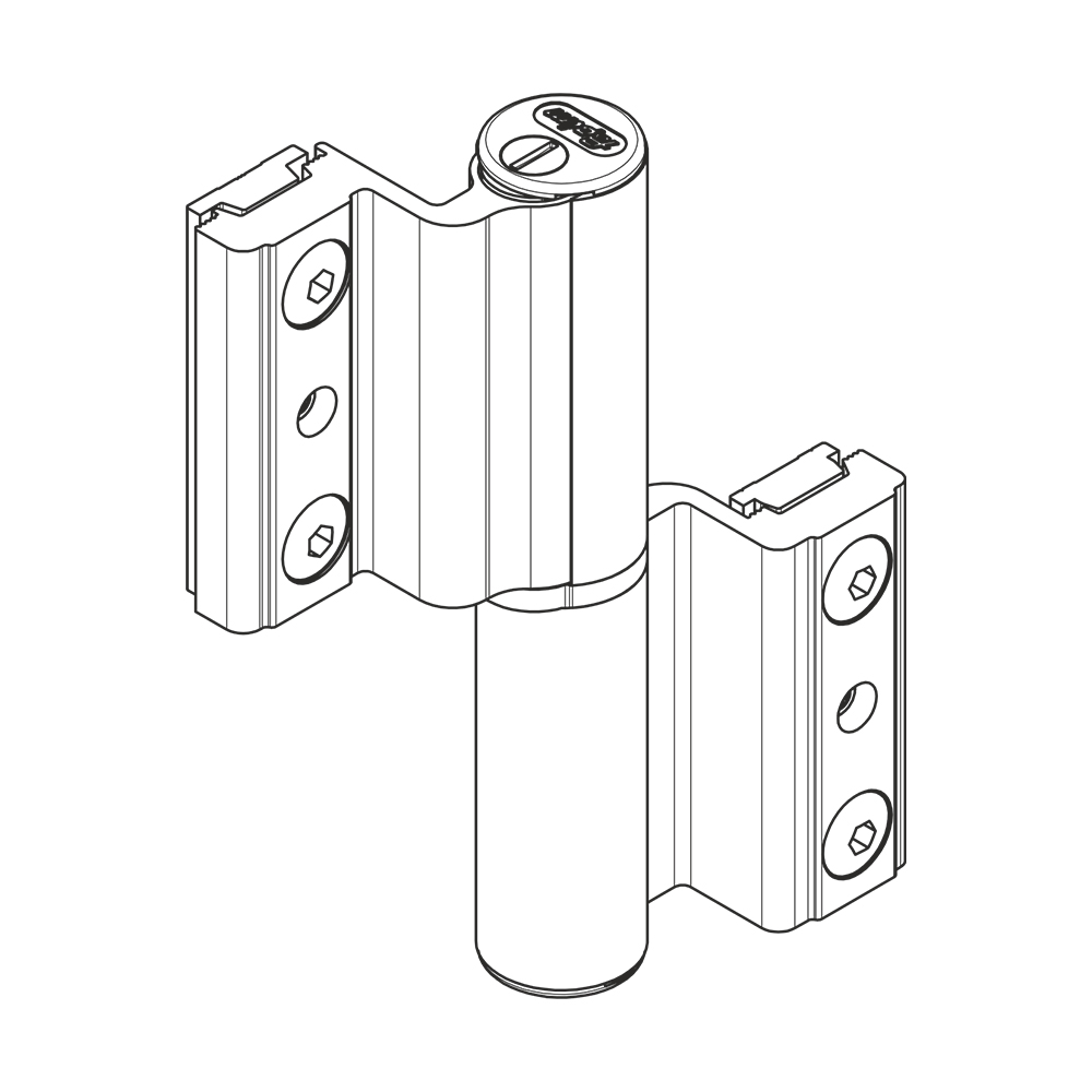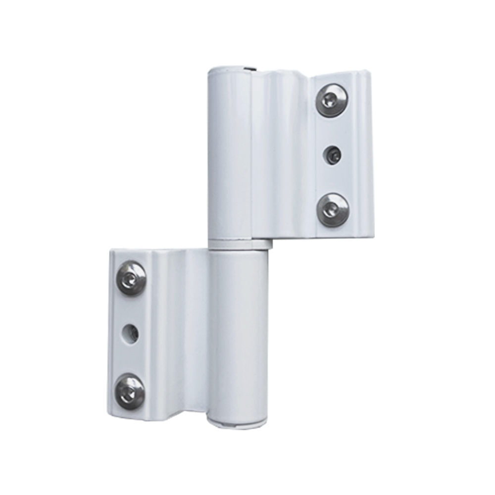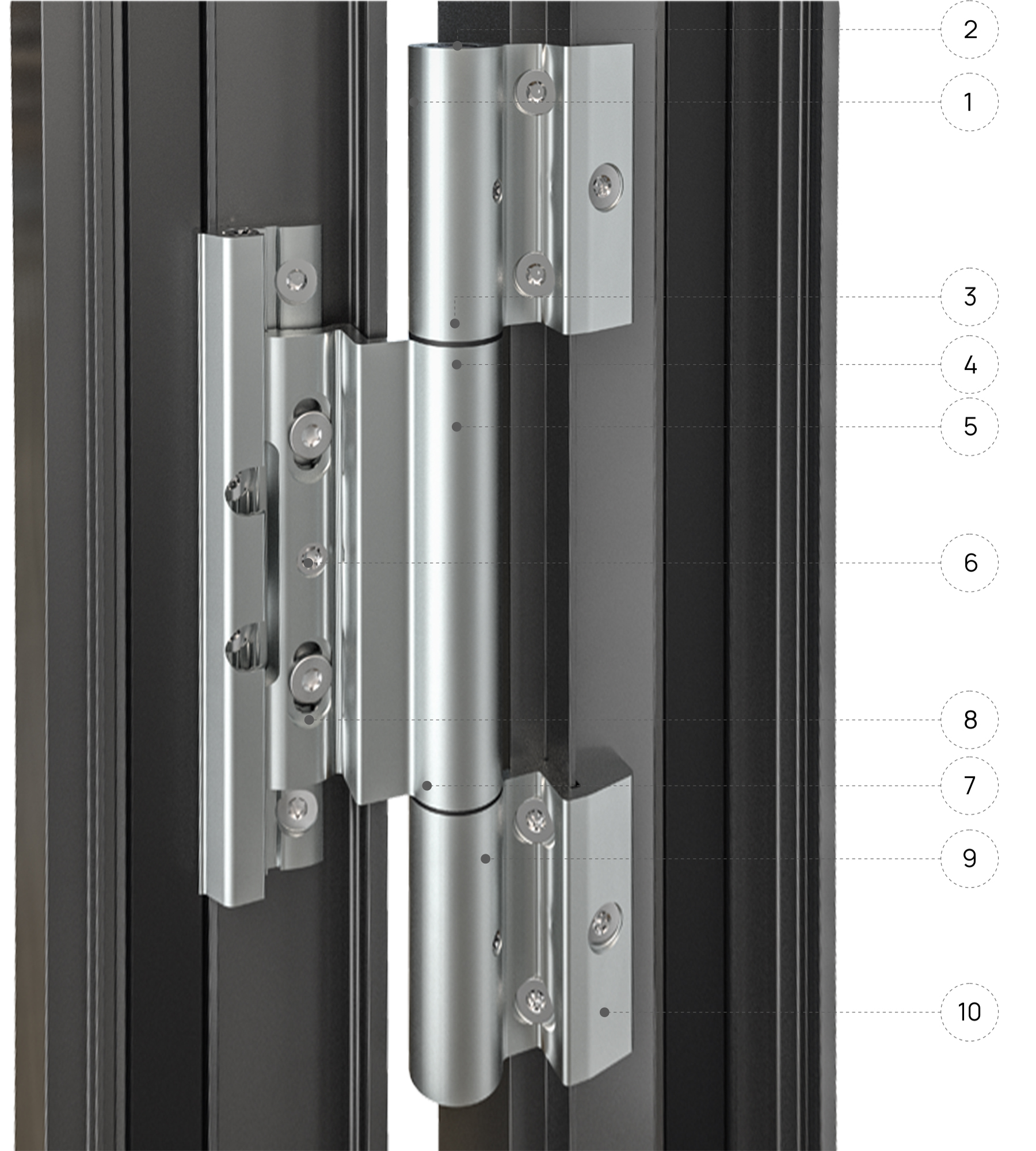 Dwuczęściowy zawias odpowiedni dla drzwi wykonanych z profili okiennych. Korpus i blachy montażowe wykonane są z ekstrudowanego aluminium, regulowany sworzeń z nylonu, oś i śruby ze stali nierdzewnej, osłonki z nylonu.