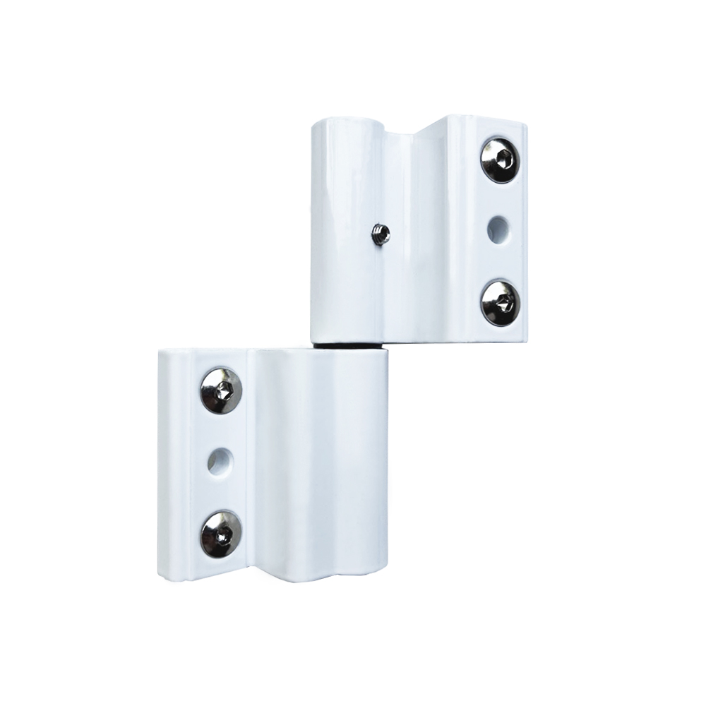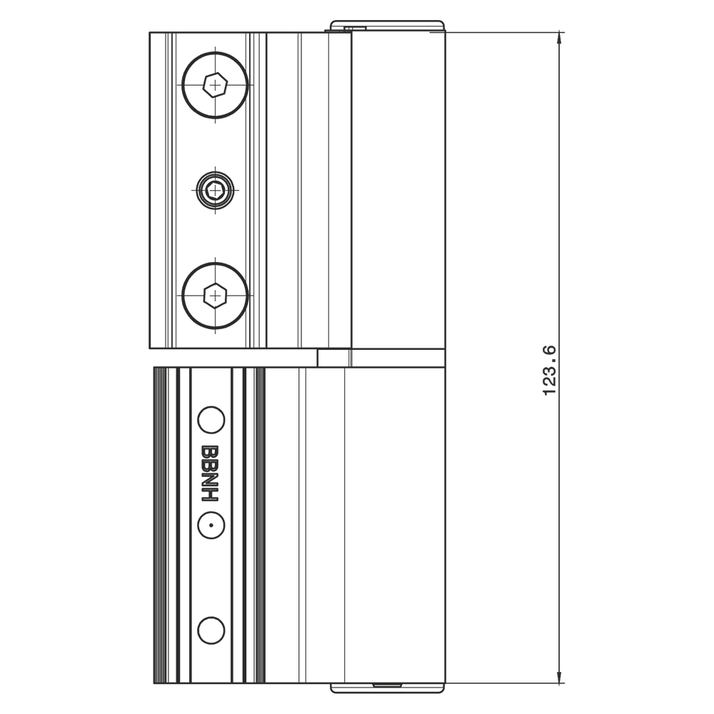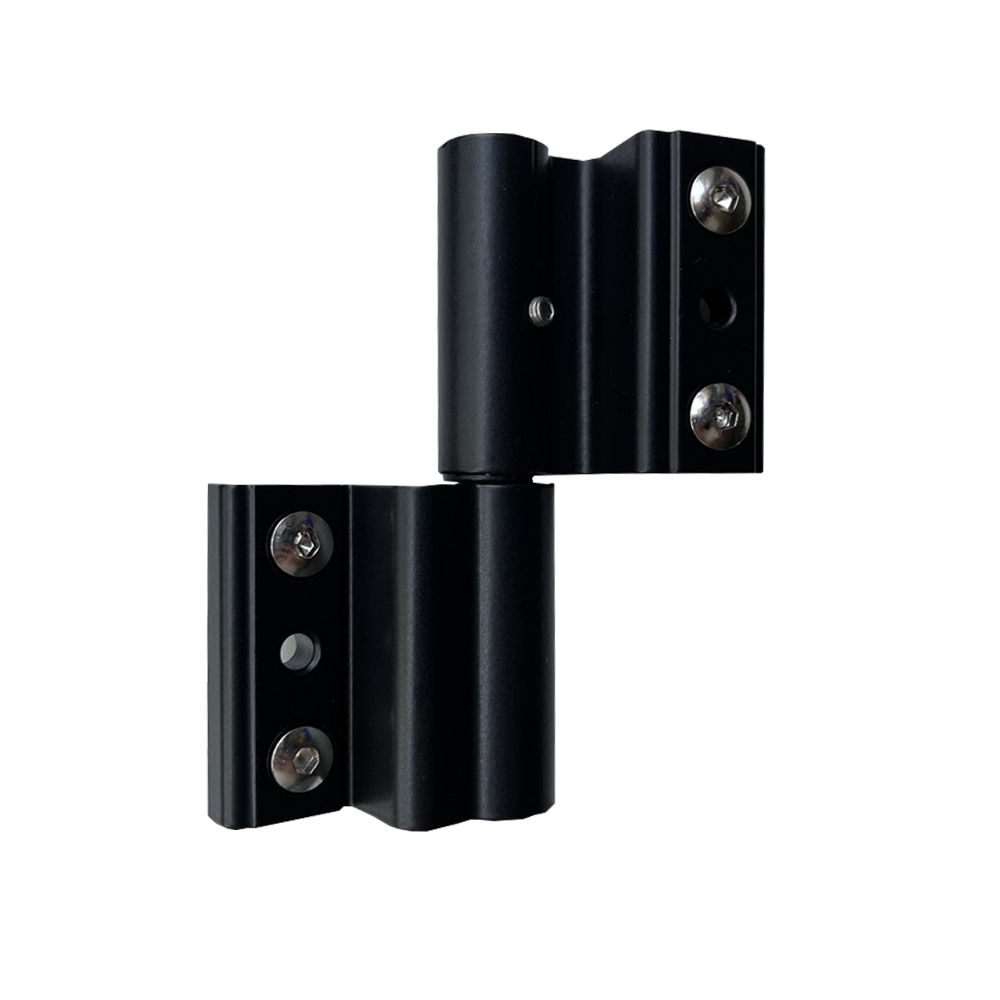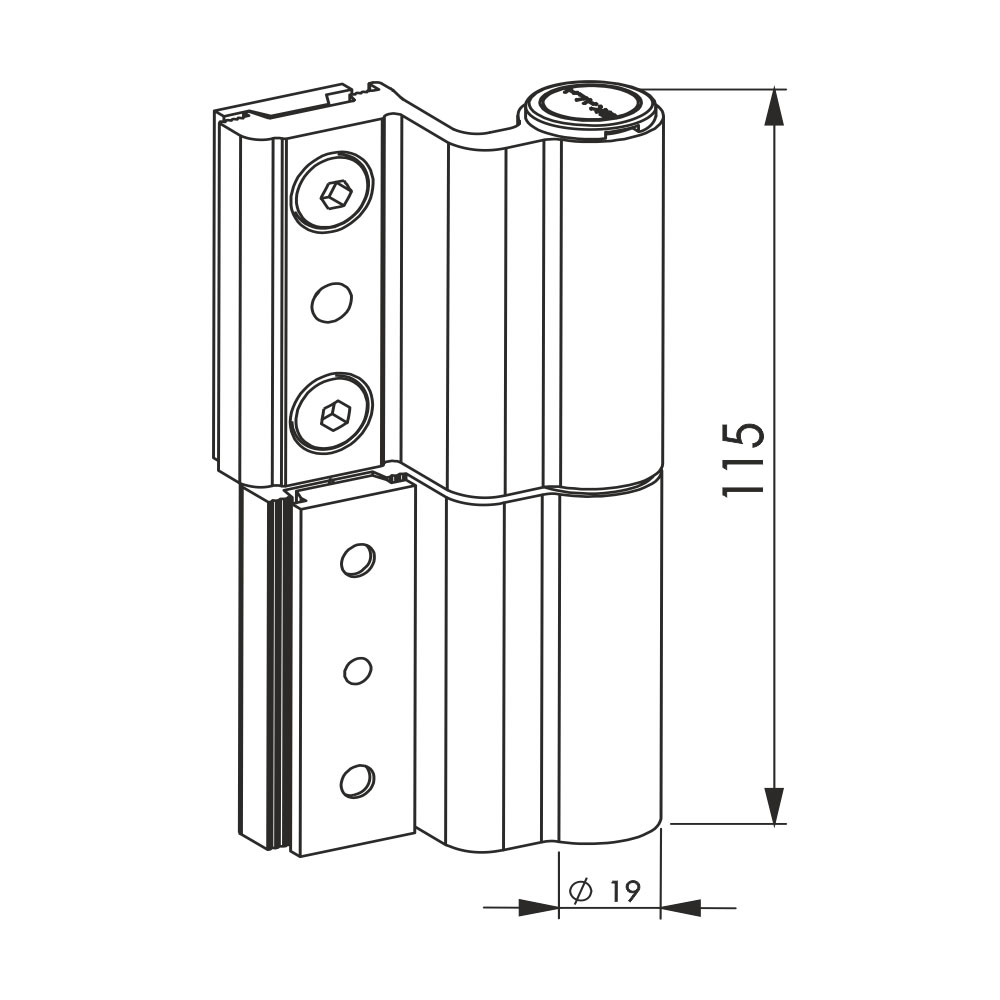 Dwuczęściowy zawias odpowiedni dla drzwi wykonanych z profili okiennych. Korpus i blachy montażowe wykonane są z ekstrudowanego aluminium, regulowany sworzeń z nylonu, oś i śruby ze stali nierdzewnej, osłonki z nylonu.