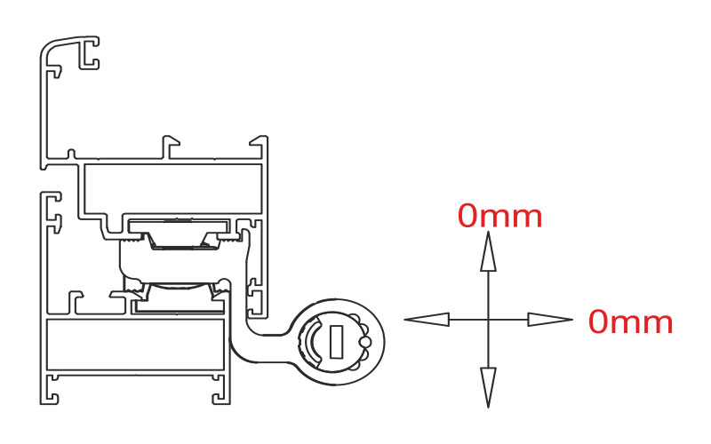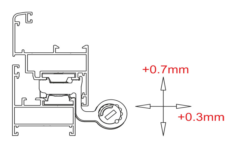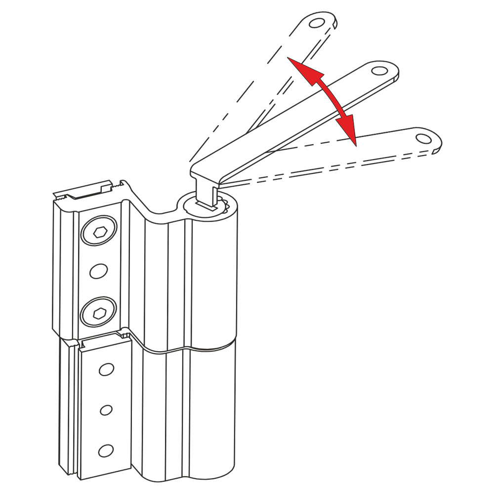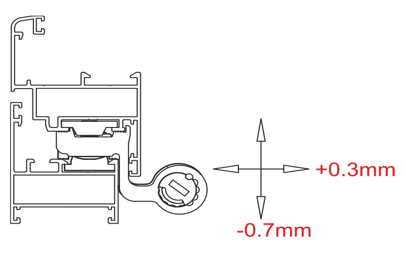 Możliwa regulacja w poziomie (+/- 2mm) i pionie (0/+4mm) przy zamkniętym skrzydle, regulacja docisku (+/- 0,5mm) poprzez obrót sworznia.