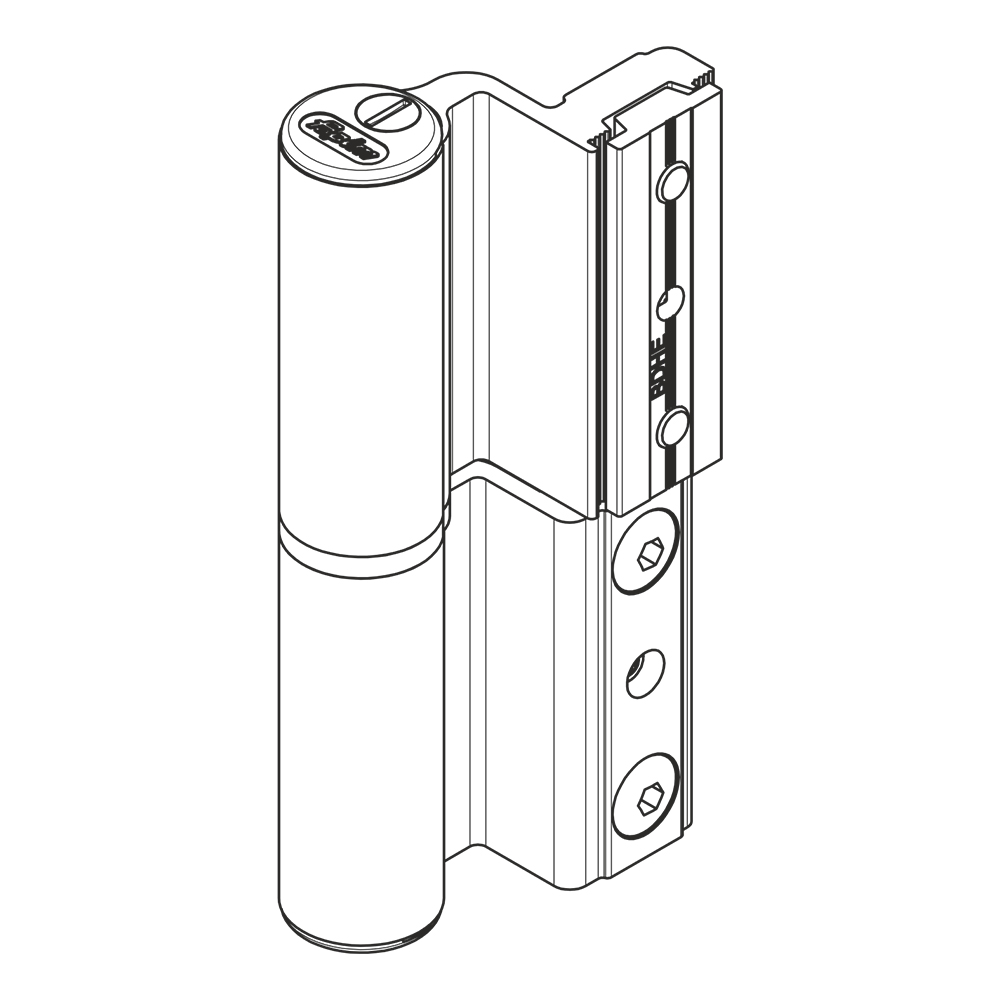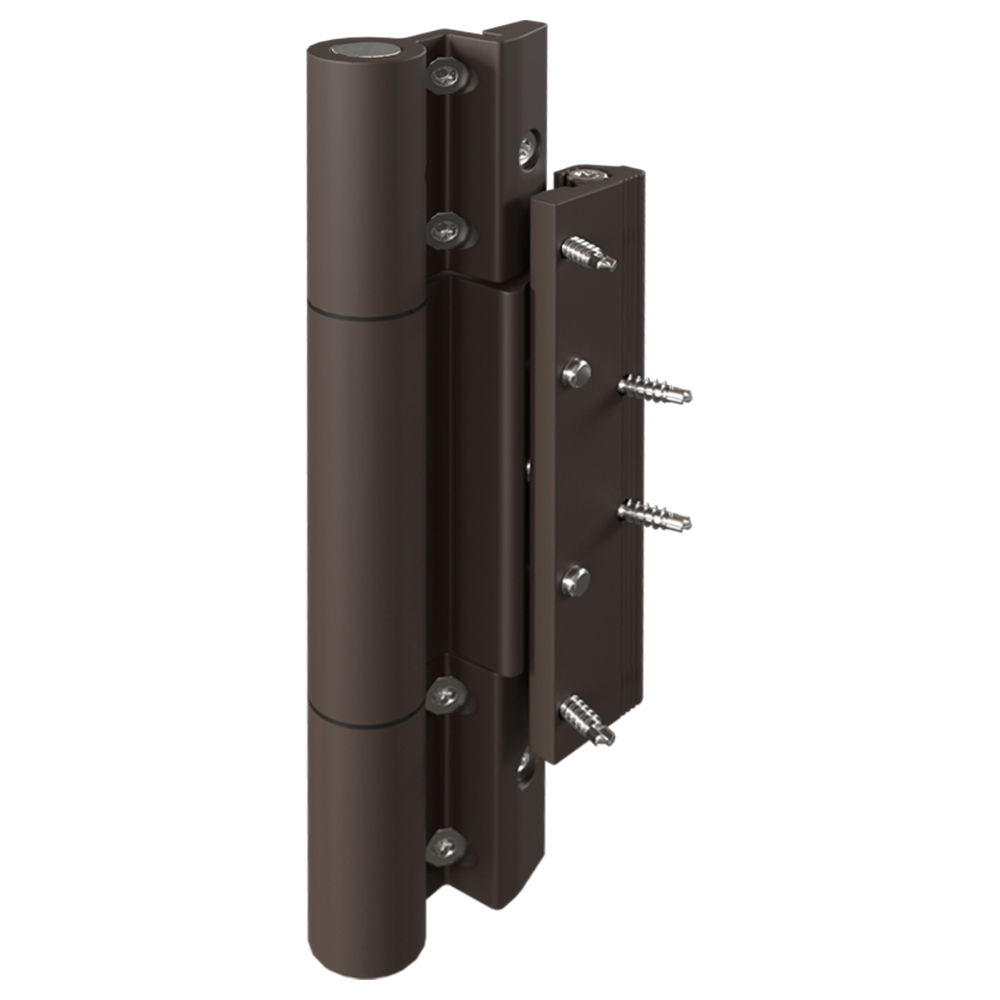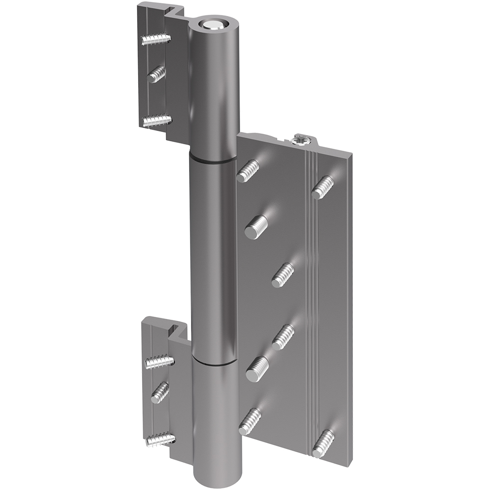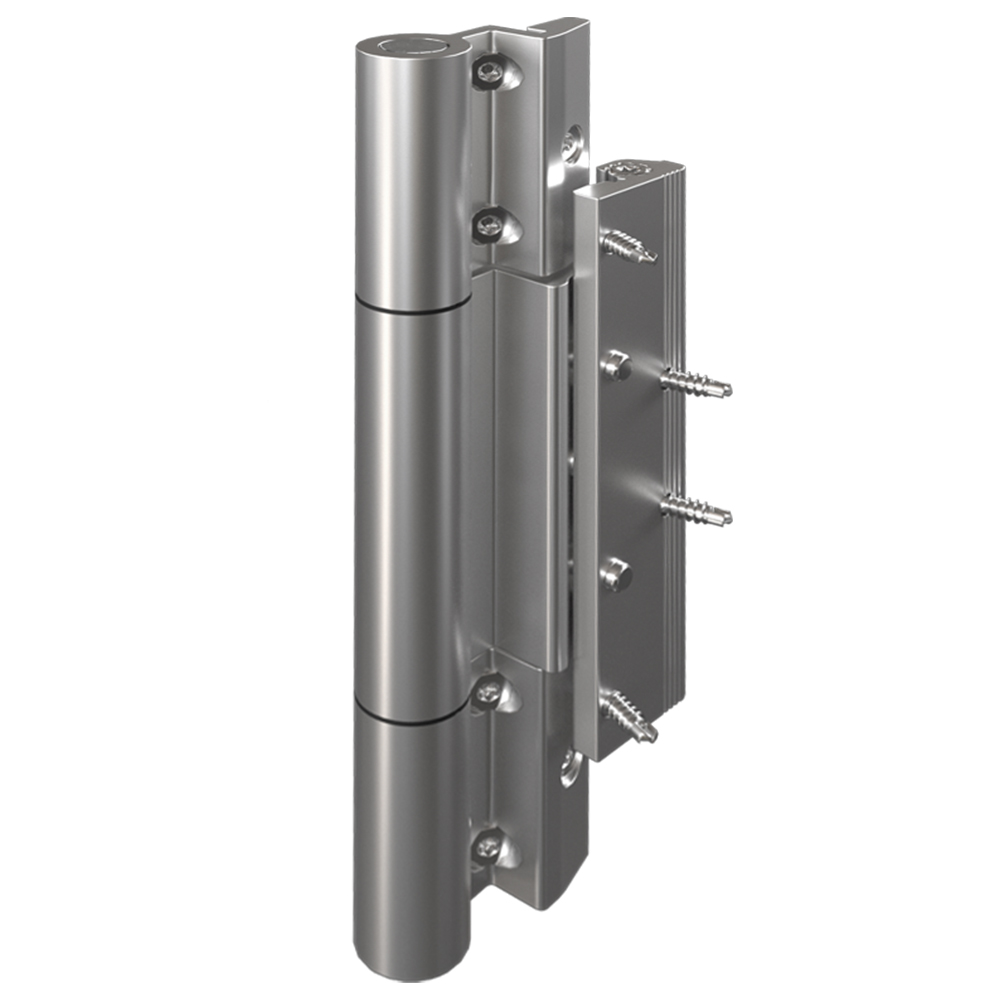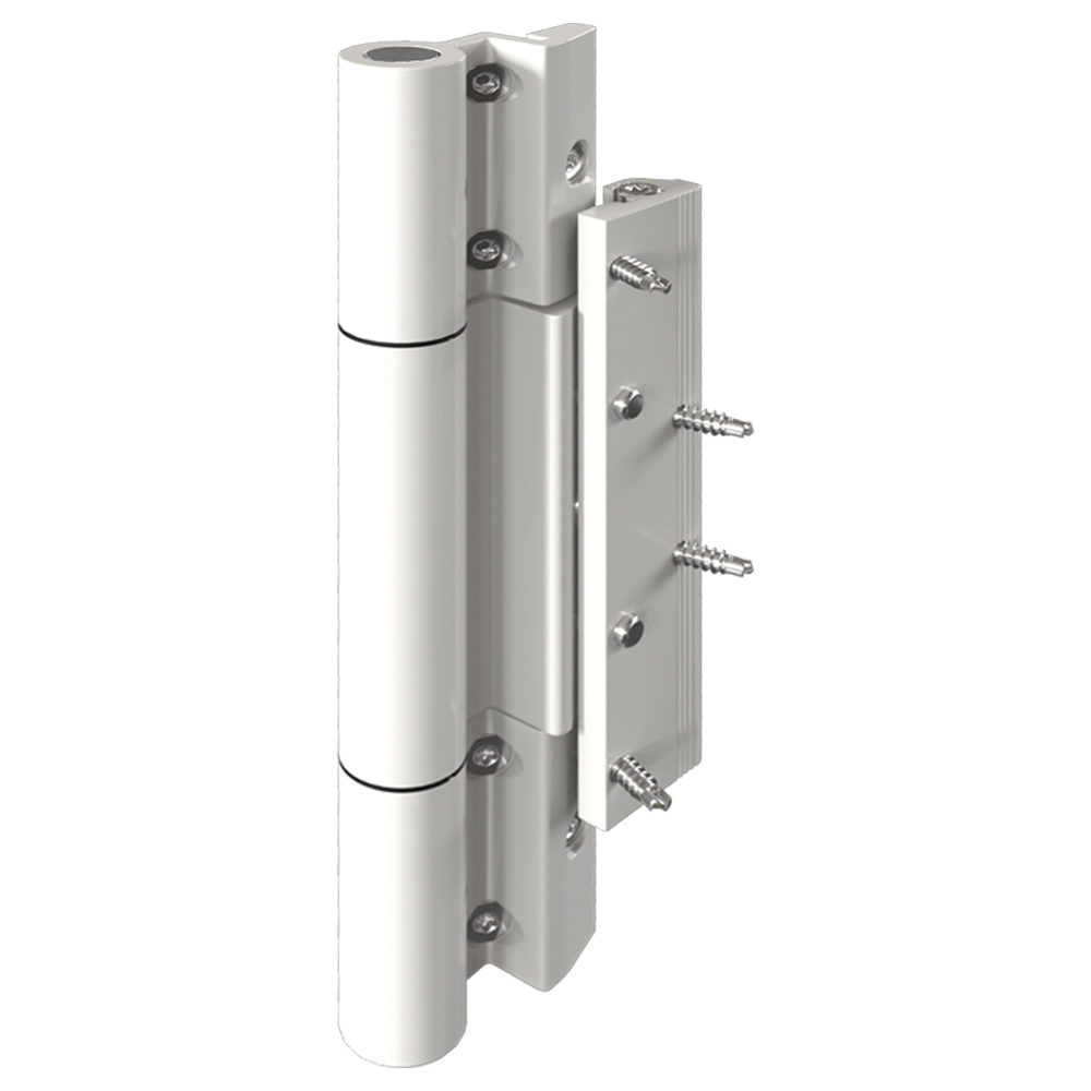 Dwuczęściowy zawias odpowiedni dla drzwi wykonanych z profili okiennych. Korpus i blachy montażowe wykonane są z ekstrudowanego aluminium, regulowany sworzeń z Delrin®, oś i śruby ze stali nierdzewnej, osłonki z nylonu. Dostarczany jest w pełni zmontowany z blachami montażowymi.