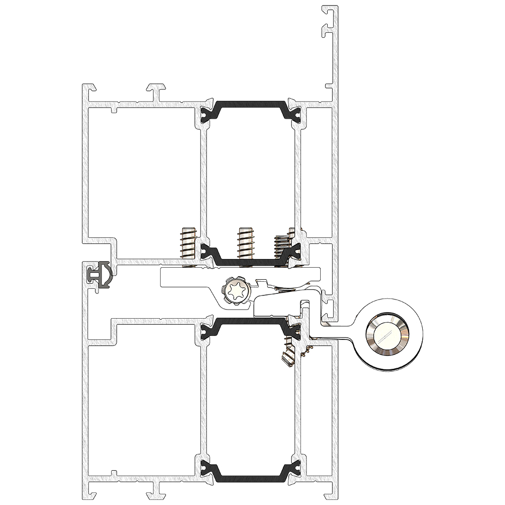 Mocowany bezpośrednio w rowkach na profilu za pomocą listwy kontrującej, dostarczanej w zmontowanej formie, bez konieczności obróbki mechanicznej, a na skrzydle mocowany za pomocą śrub.